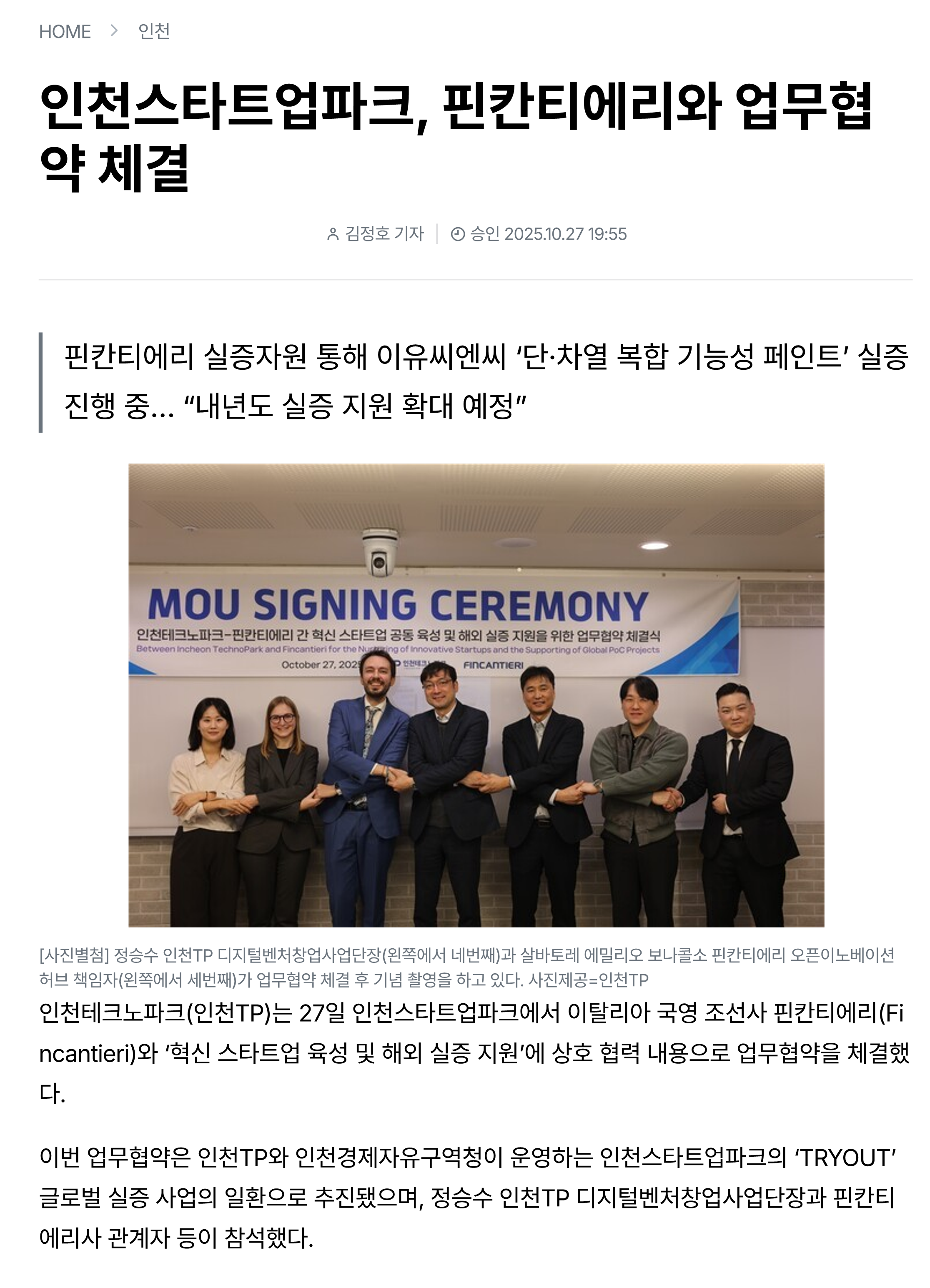 핀칸티에리 실증자원 통해 이유씨엔씨 ‘단·차열 복합 기능성 페인트’ 실증 진행 중