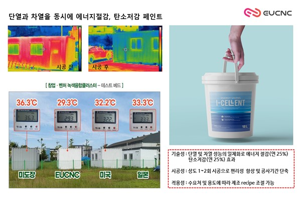 이유씨엔씨 페인트의 첫번째 강점으로는 탄소저감이 가능한 제품으로 하절기에는 일반 반사율 94.4%를 보여주며 건물의 온도상승을 낮추고 동절기에는 미도장 대비 단열기능이 뛰어나 우수한 보온효과를 보여주는 제품이다. 도포시 8~13℃의 온도 저감 효과(연평균 25~30% 에너지절감)가 있으며, 타사의 단차열 코팅제보다 성능이 2배 이상 뛰어나다. 페인트 자체로 열전도율 및 일반 반사율은 세계 최고 수준의 성능을 나타내고 있다. 환경부의 녹색기술 인증서와 조달청의 혁신제품 인증서를 획득하였으며, 온실가스 배출량 절감율 최고 수준으로(약50%절감) KCL(기후환경실증센터)에서 공인시험성적서를 획득하였다.