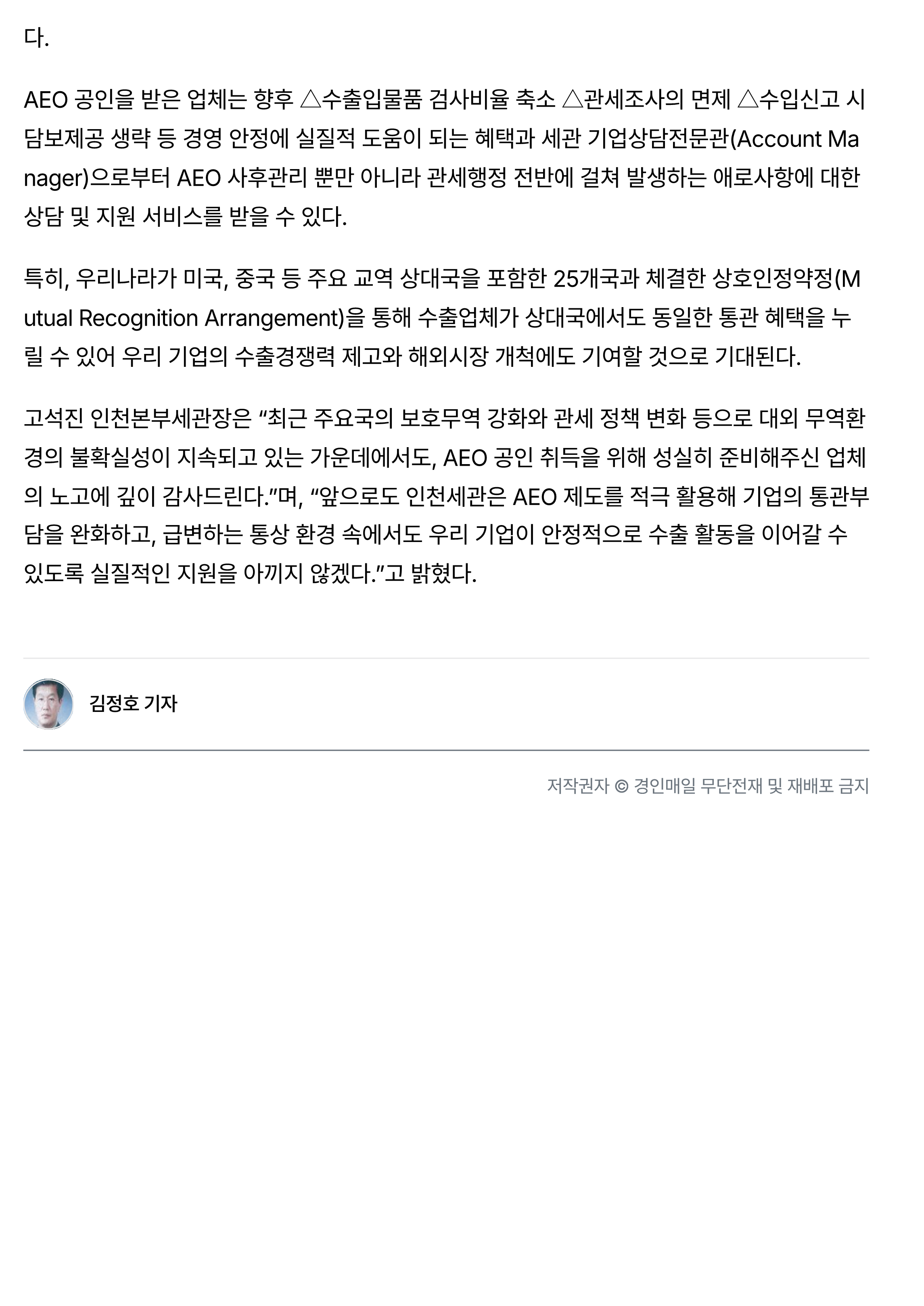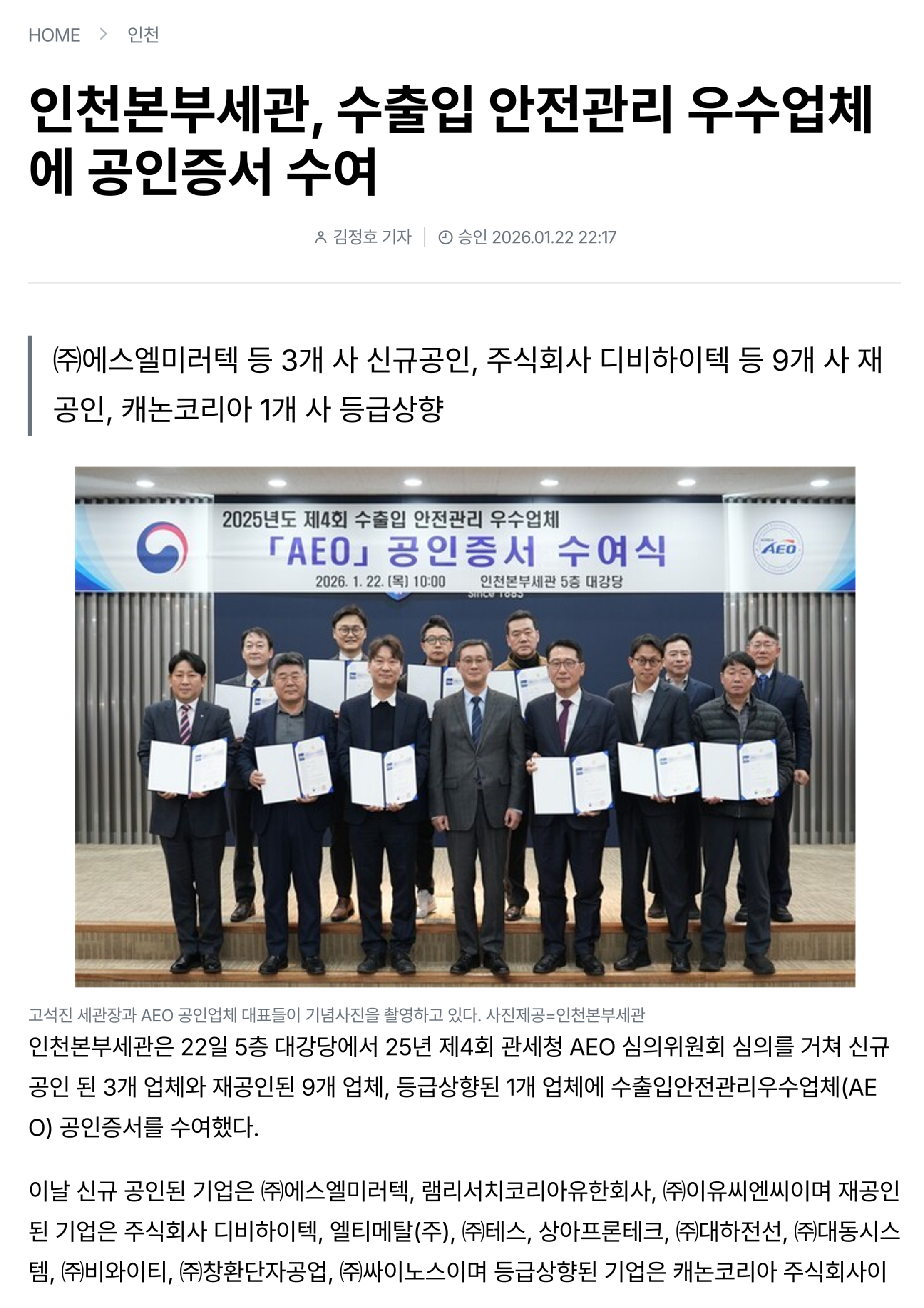 인천본부세관, AEO 공인으로 국제 무역 경쟁력 강화